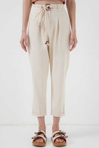 • 6660 Kemerli Keten Pantolon Krem